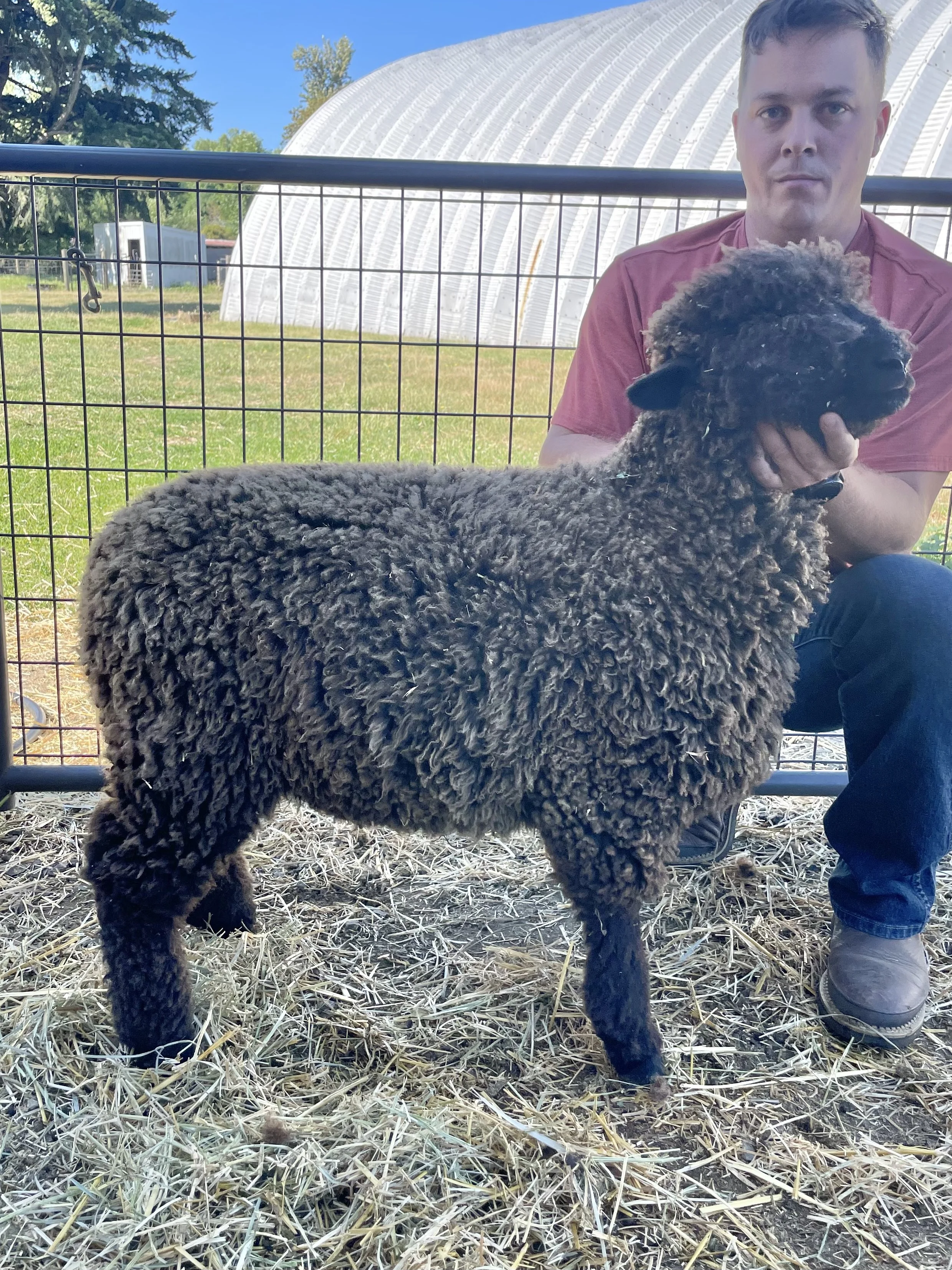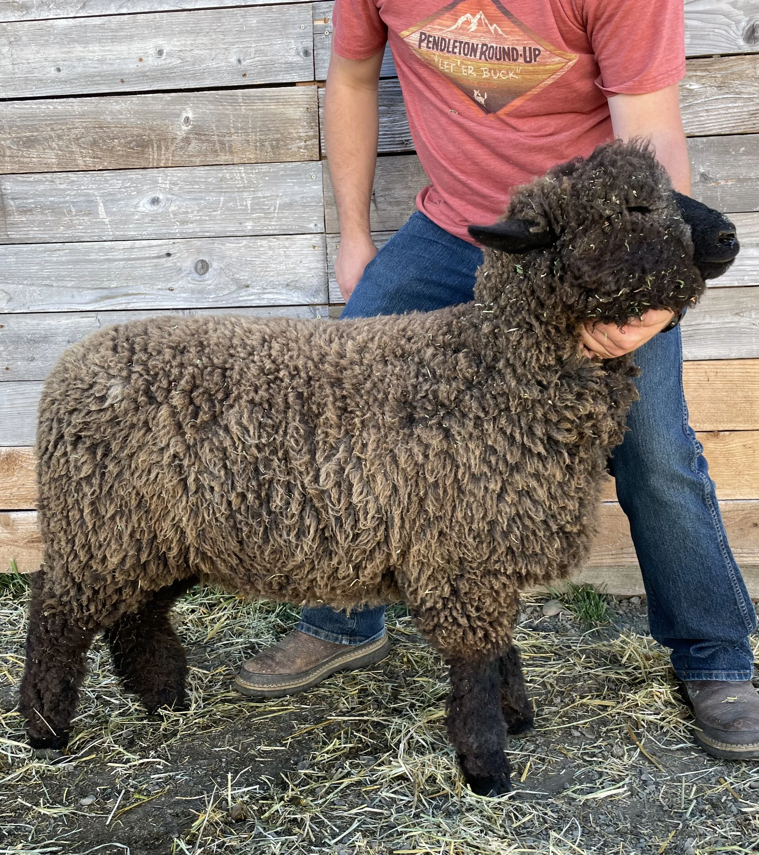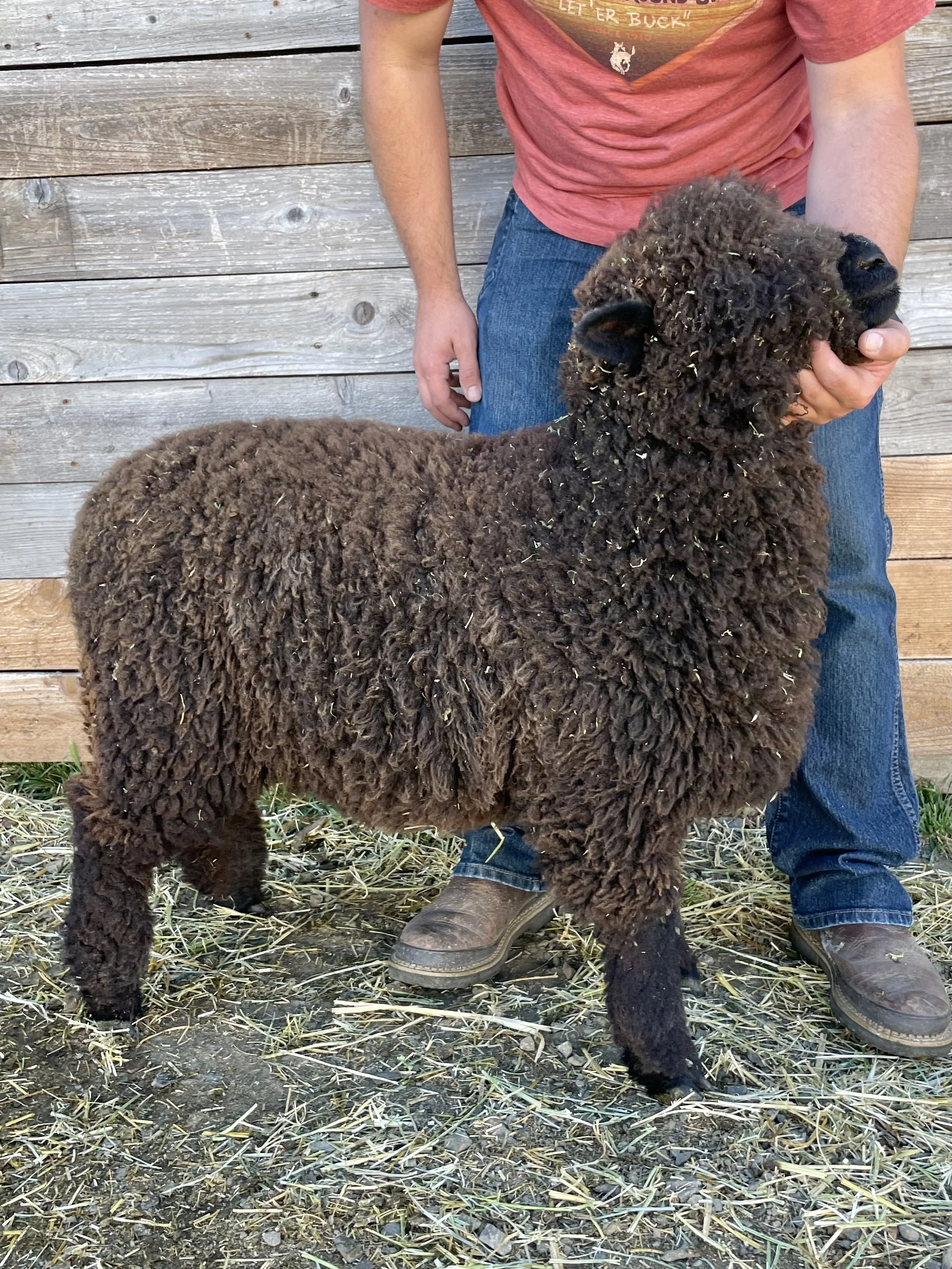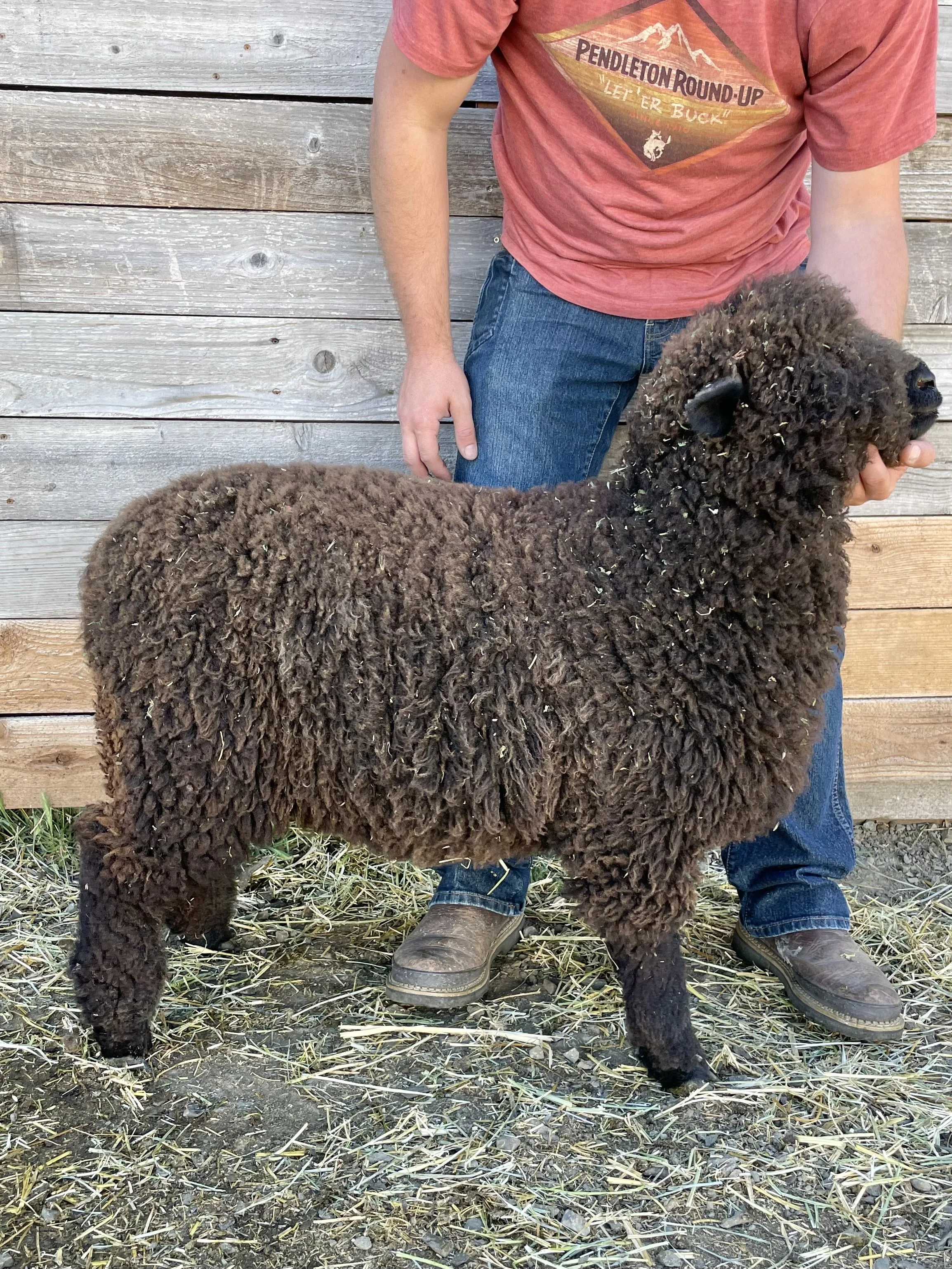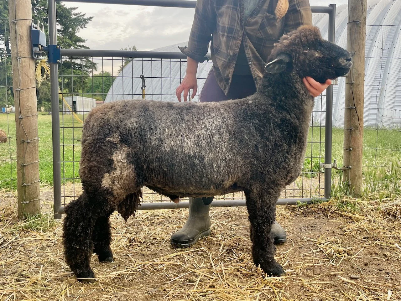 This guy is built! I am loving his size and structure. Heath has a good fleece in a very dark color. He is built well and comes from good material lines. Heath has an easy personality and has been handled as a show lamb. Heath is the 2025 Estes Park Wool Market Reserve Supreme Champion Ram. $600