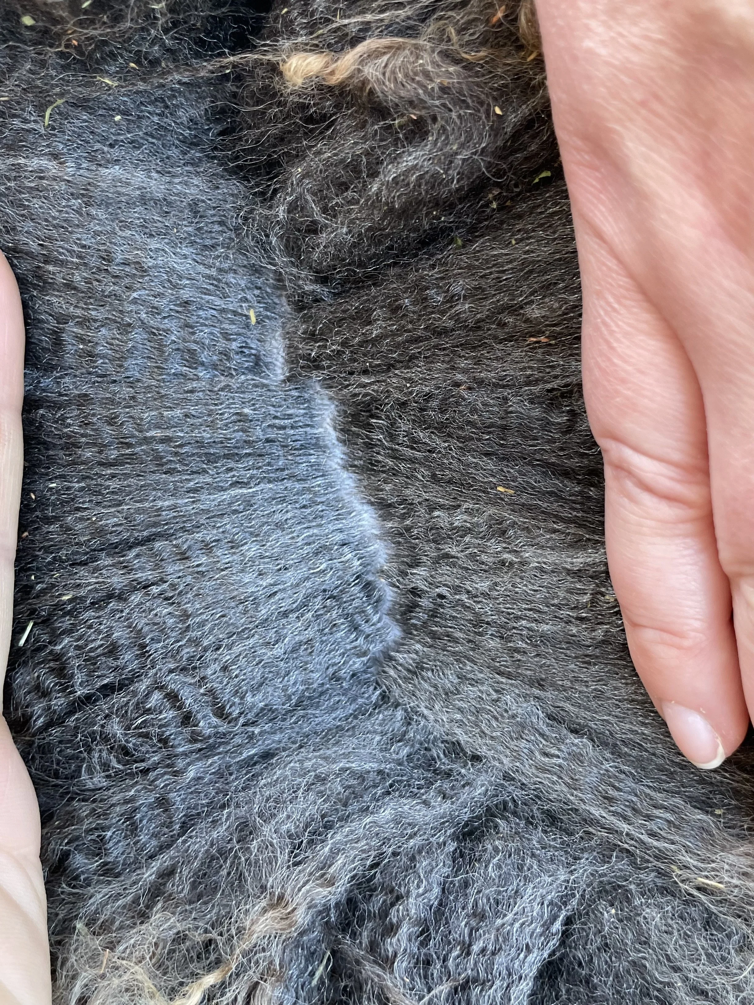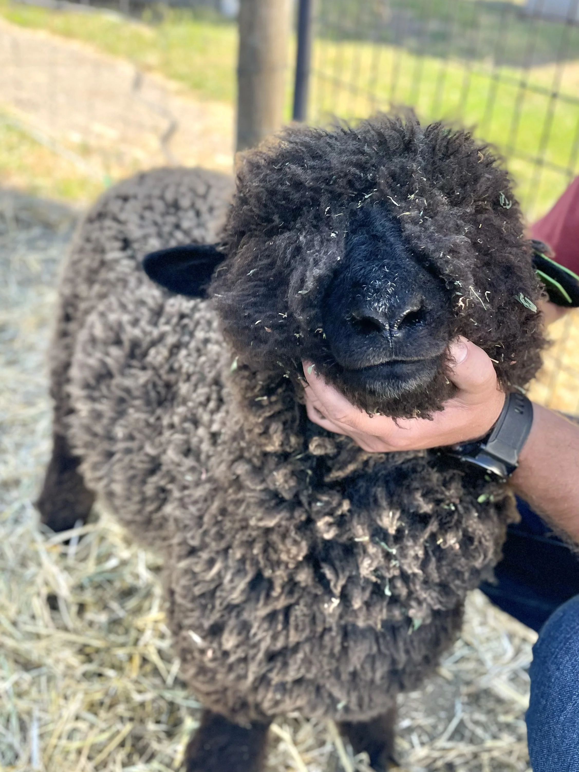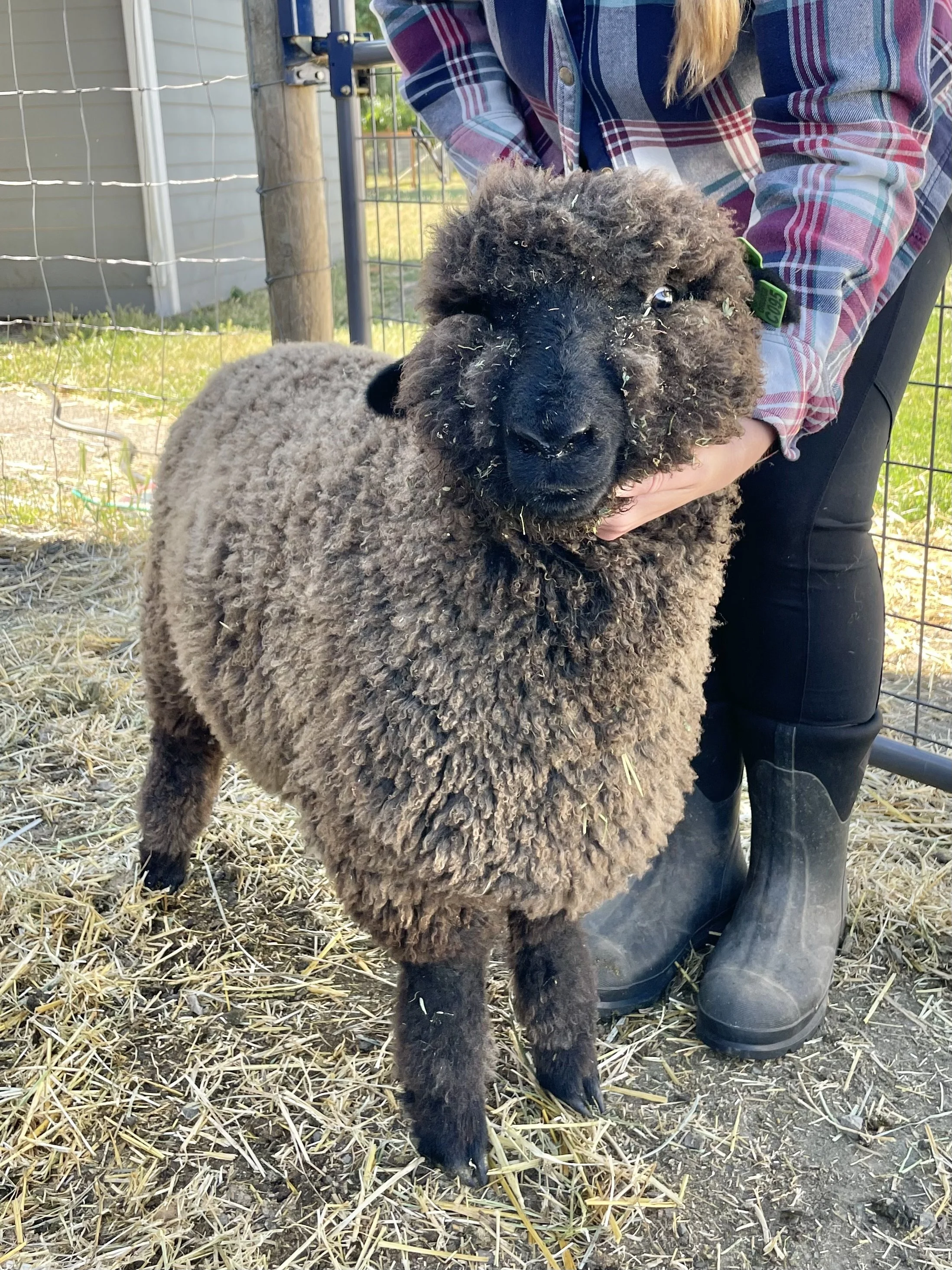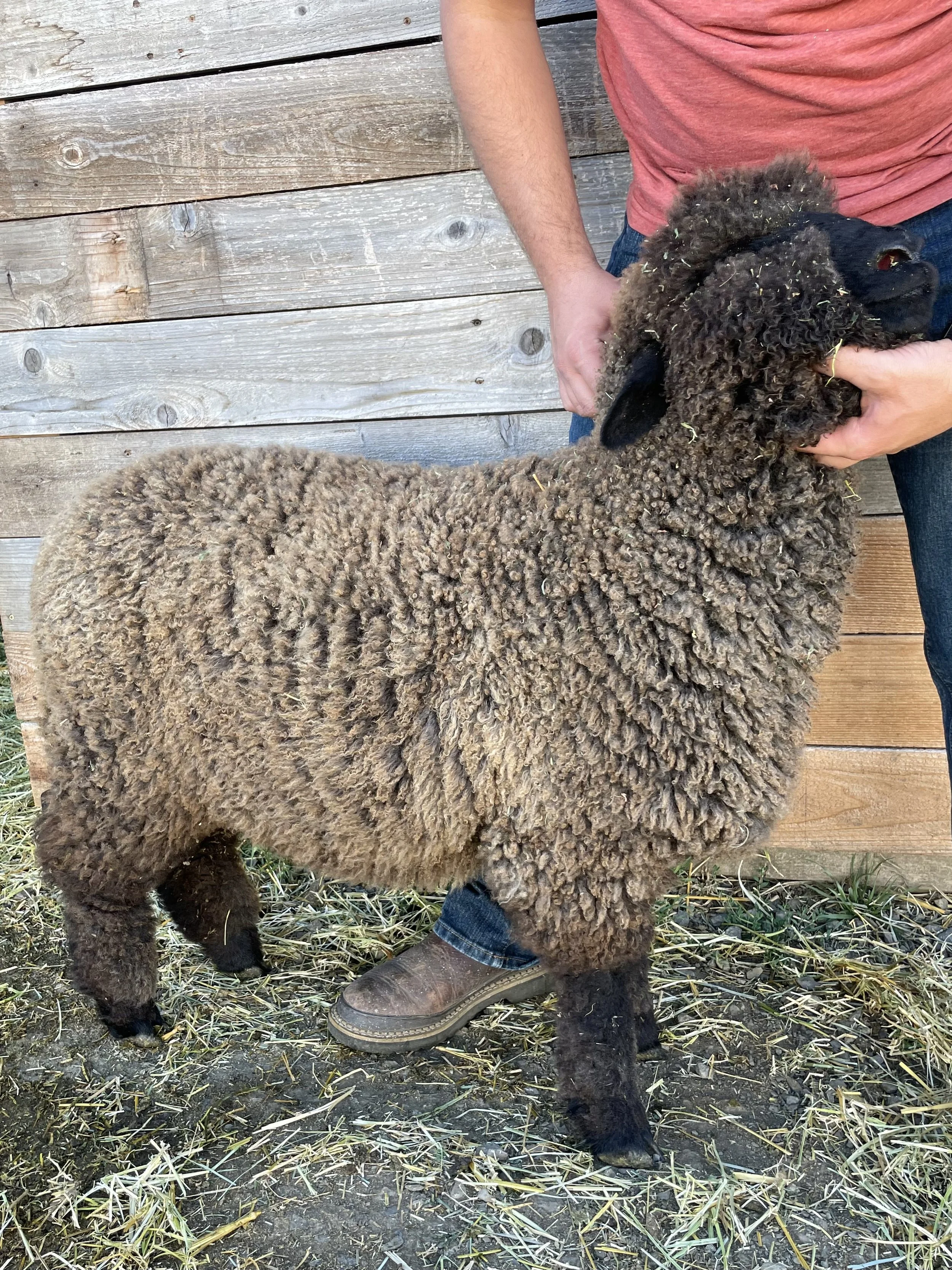 If you are looking for a fantastic fleeced ewe, this is it! Rye has the classic Romney fleece with a great hand. The solid dark color is also wonderful. She has a good structure, a really complete ewe lamb. Rye has been handled as a show lamb. She is the 2025 Black Sheep Gathering Champion NC Romney Ewe. $800
